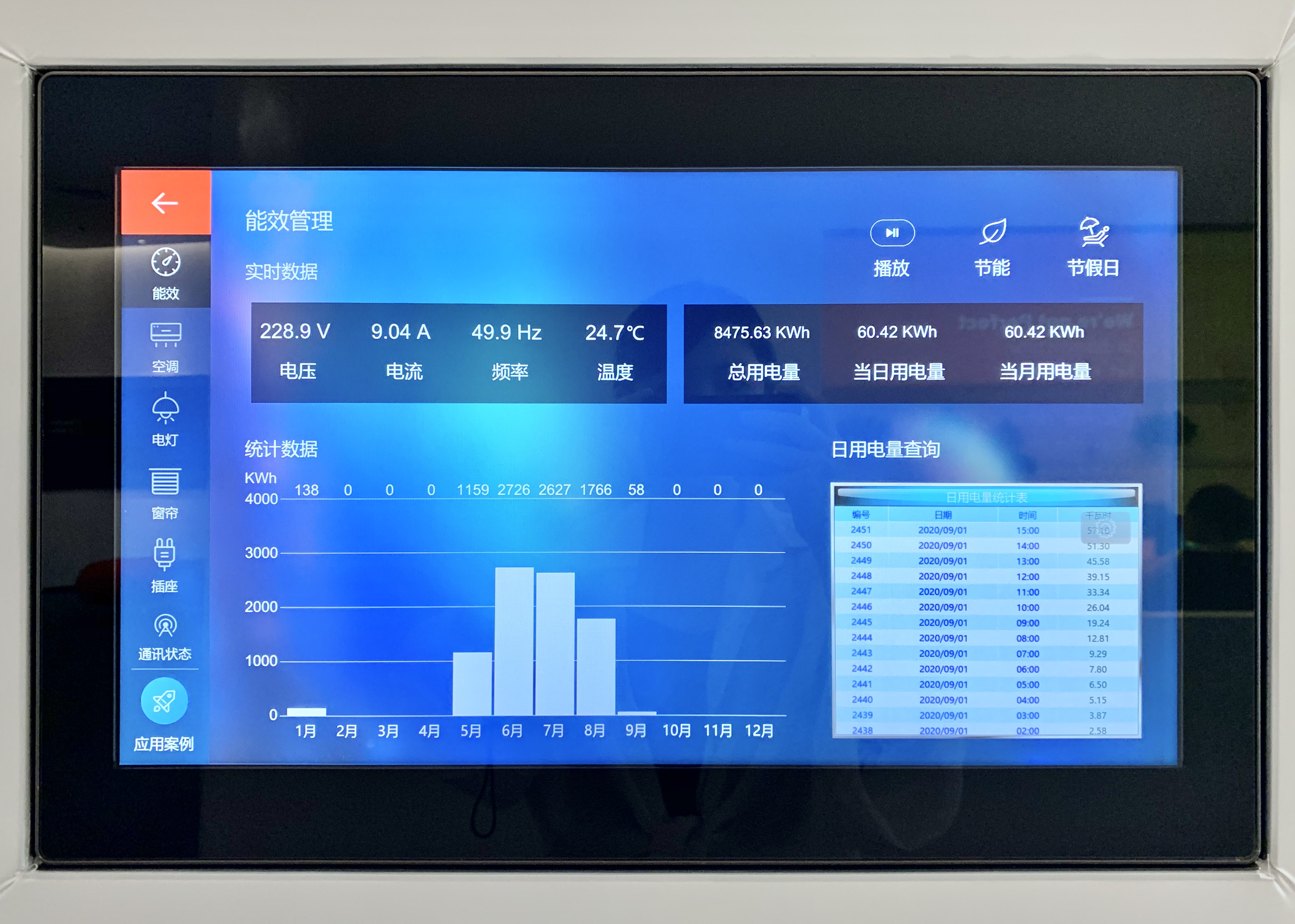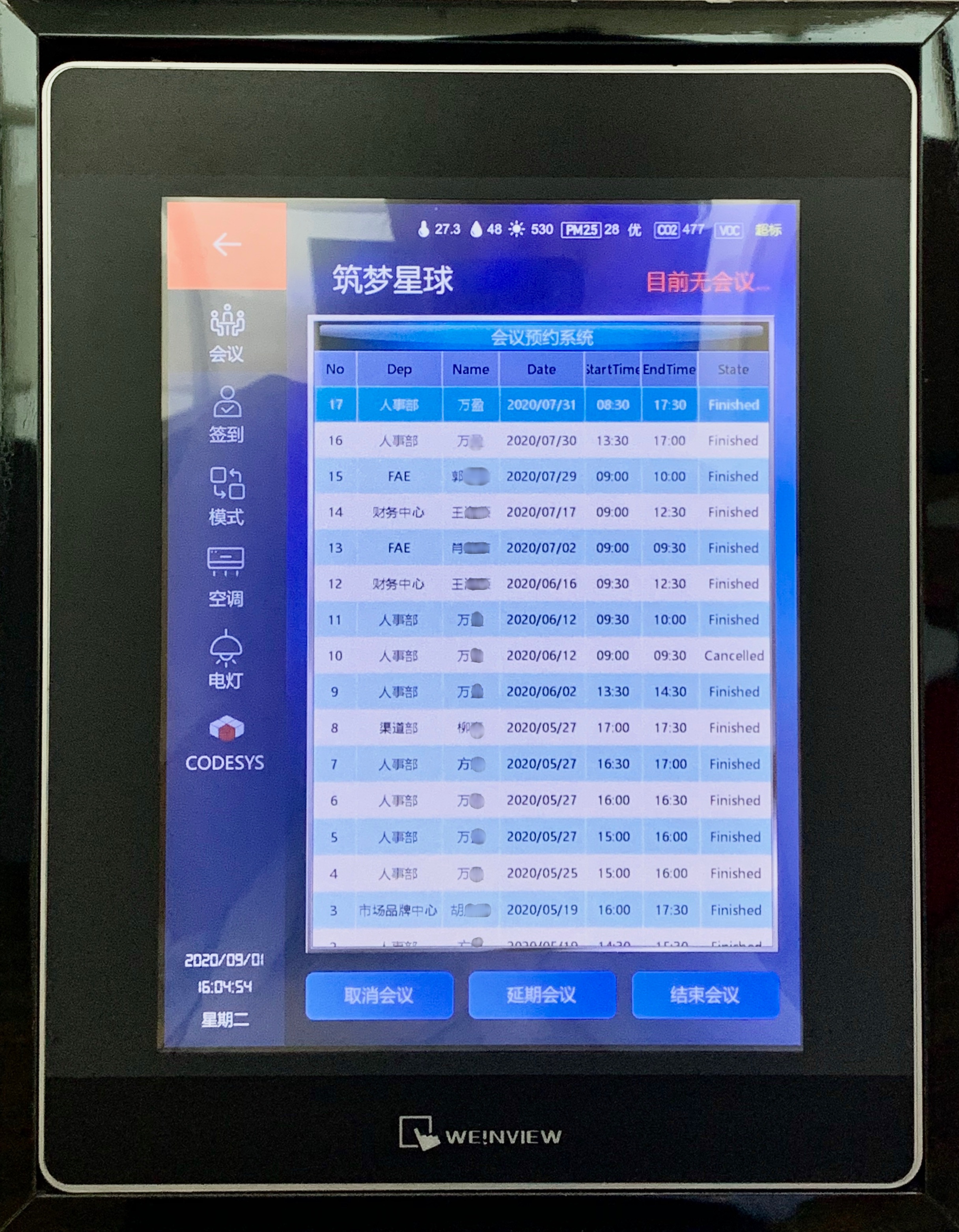 cMT人機集中控制電燈,空調,窗簾,會議預訂,音樂播放等,并能監視溫度、濕度、空氣質量、用電總量等數據。